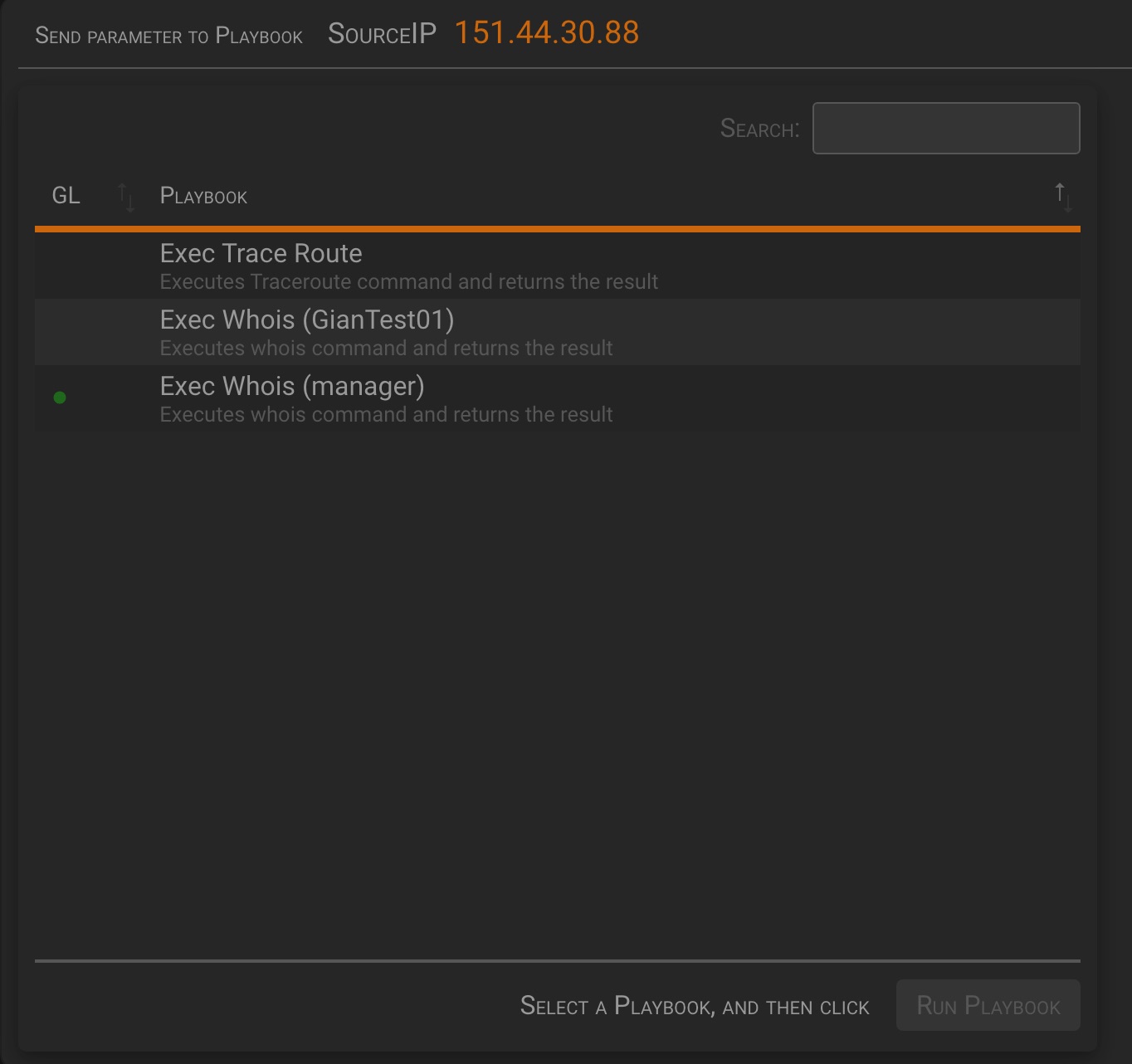 When operating from the Manager Instance, a green dot in the GL column means that the Playbook is globally defined on the Manager. Other Playbooks are related to the tenant’s alarm.