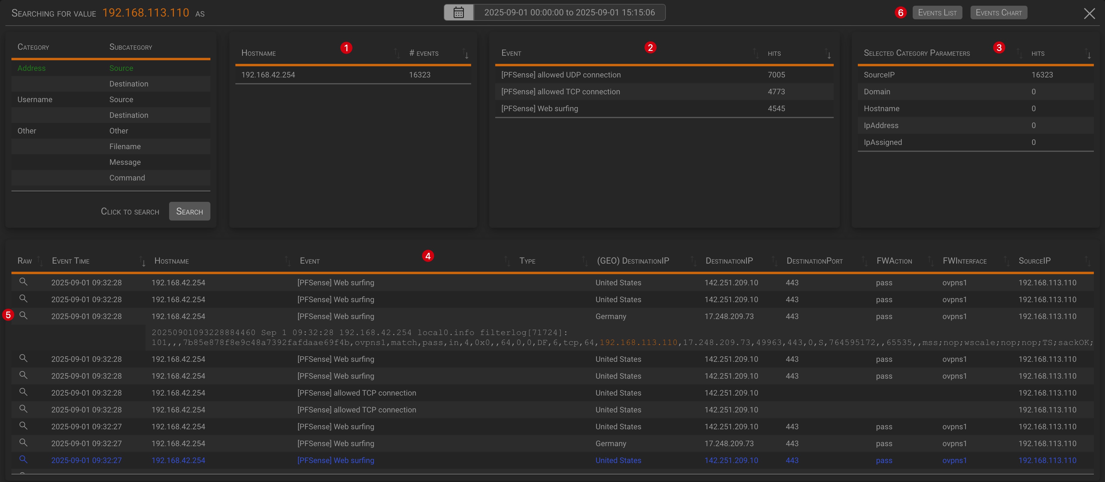 In the example we are searching all events, beyond the current one, having a parameter categorized as Address/Source. By default, the Event List view is displayed.