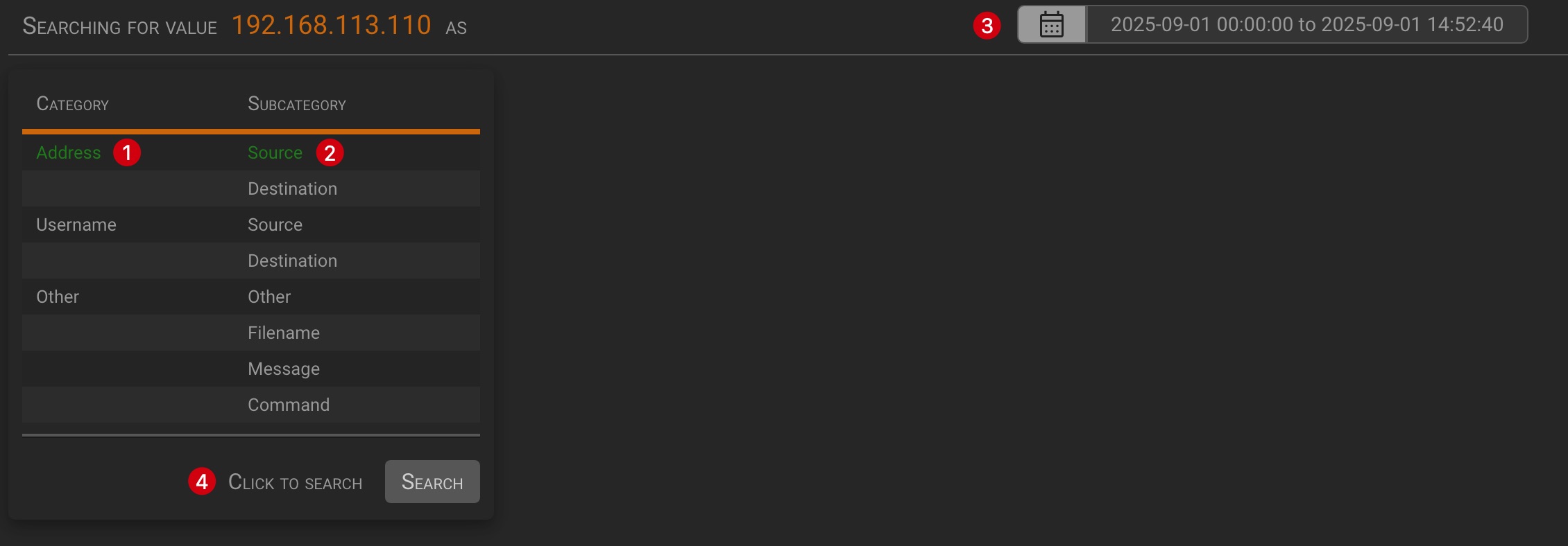 This action allow to search and display all events having the selected parameter value as one on the predefined parameter Category/Subcategory, within the specified time range.