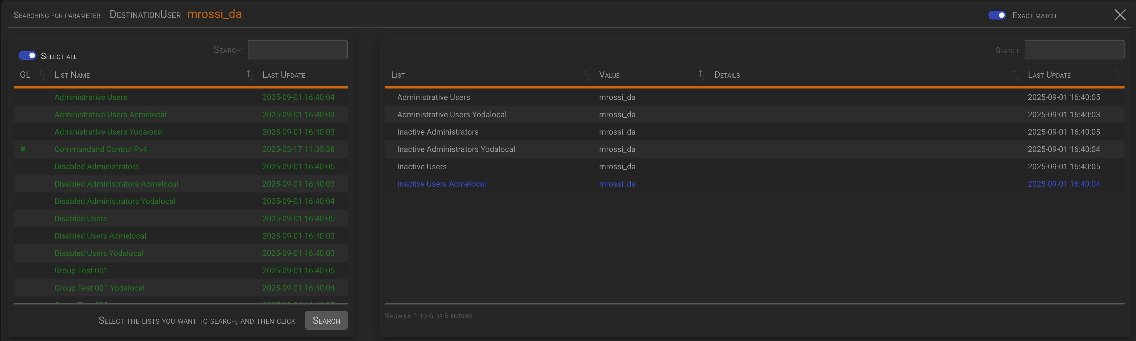This action allows you to search which of the Threat Intelligence or other lists the searched parameter value was found in.