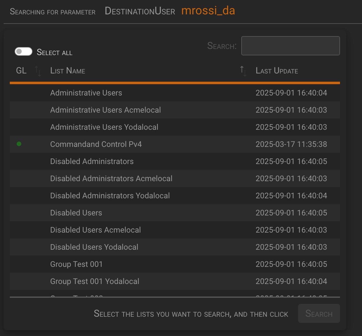 When operating from the Manager Instance, a green dot in the GL column means that the list is globally defined on the Manager. Other lists are related to the tenant’s alarm.