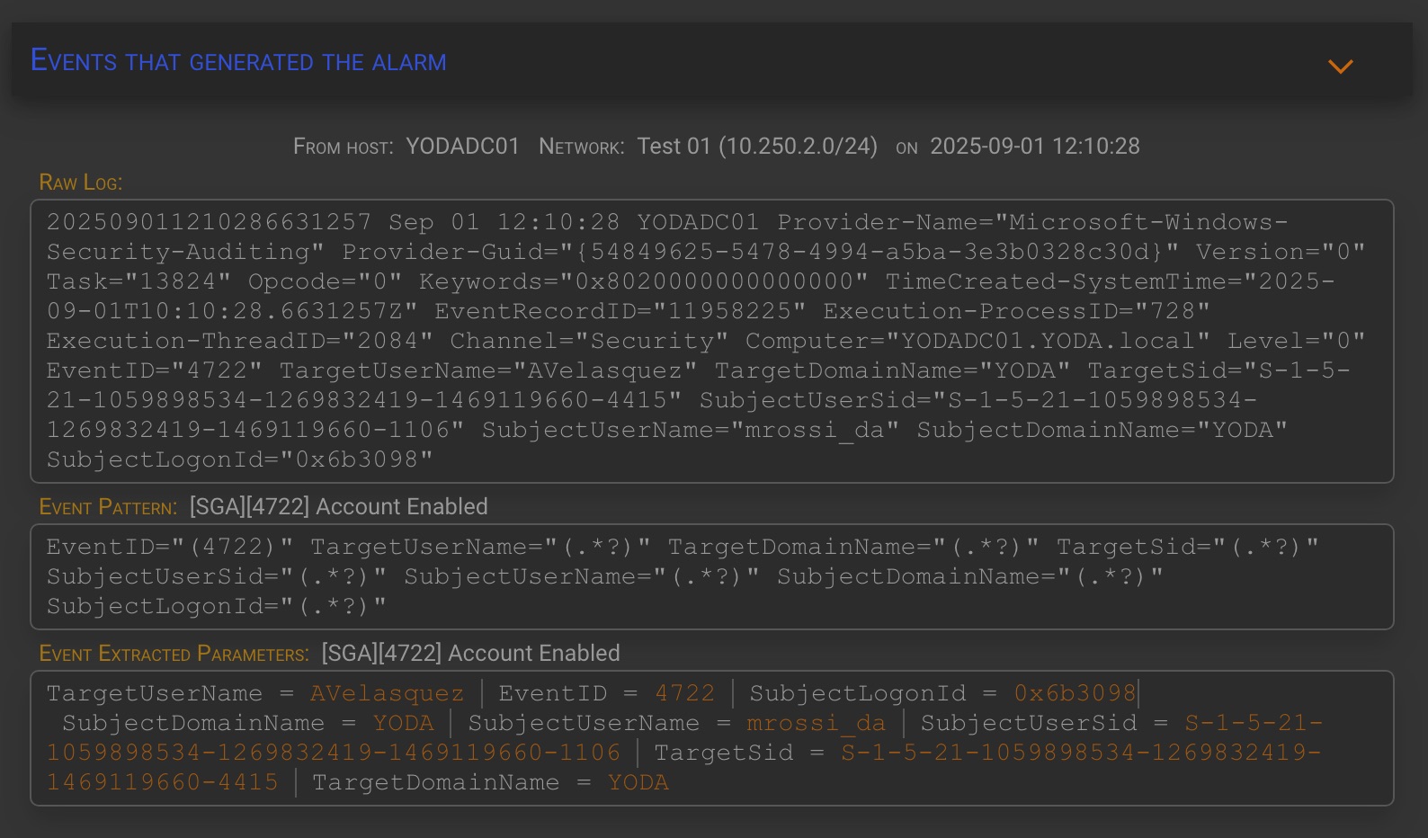 Clicking on the Events that generated the alarm tab will display the following details for each event that generated the alarm.