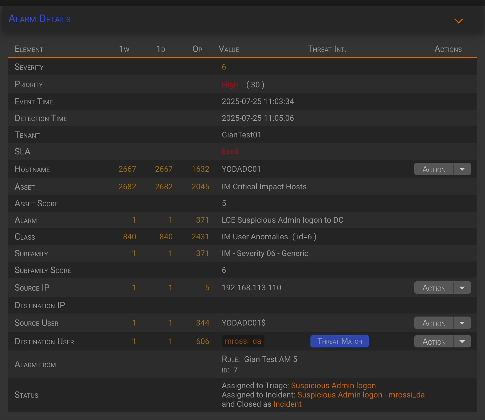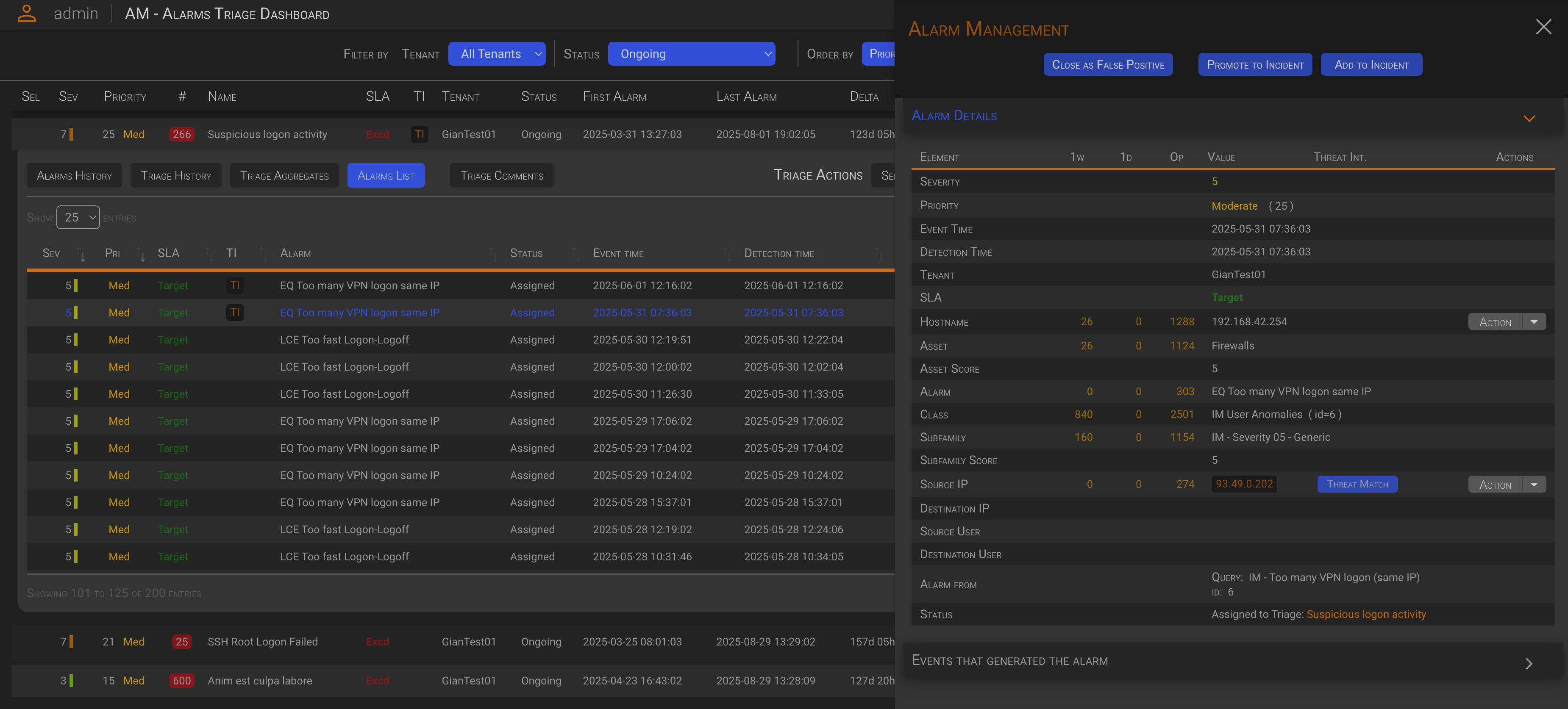 Alarm details panel is accessible from any of the Alarm List view available from Alarm, Triage and Incident dashboards. Click on an alarm row in Alarm List, or on the Open Details button under the Action column (Alarm dashbord only), to access it.