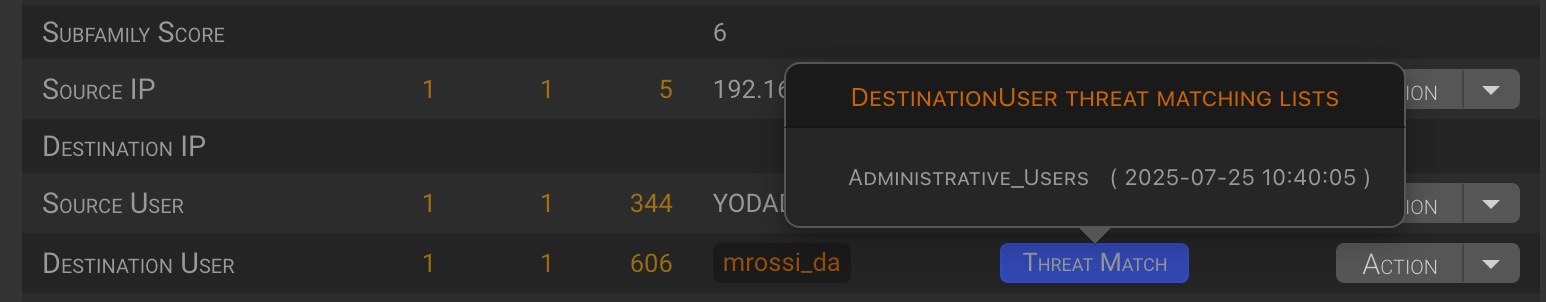 When the Threat Intelligence is enabled (see Threat Intelligence Configuration), any of the alarm’s standard parameters value found in a configured Threat Intalligence list are highlighted. Hovering on the Threat Match button will display a pop-up containing the lists in which the parameter was found and the list last update date.