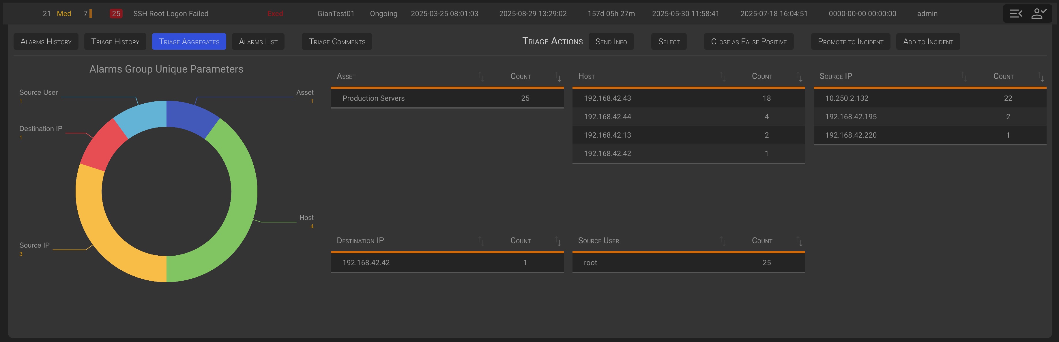 In the Triage Aggregate tab you will see an aggregate overview of the events’ parameters within the triage.