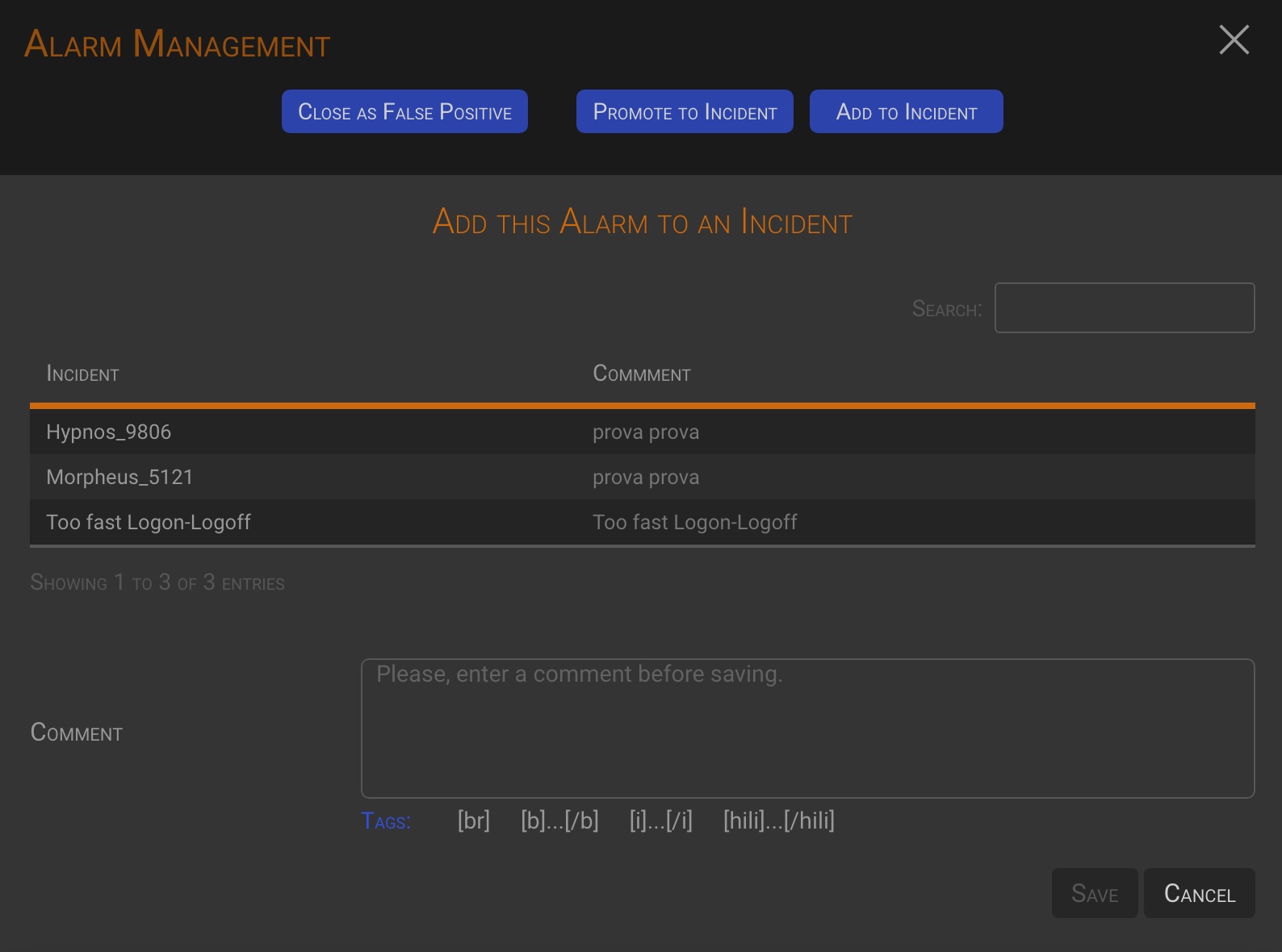 Select the incident to which you want to add the alarm to by clicking on the incident line in the incident table (the line will turn green). After entering a Comment, the Save button will be enabled, allowing you to add the current alarm to the selected incident.