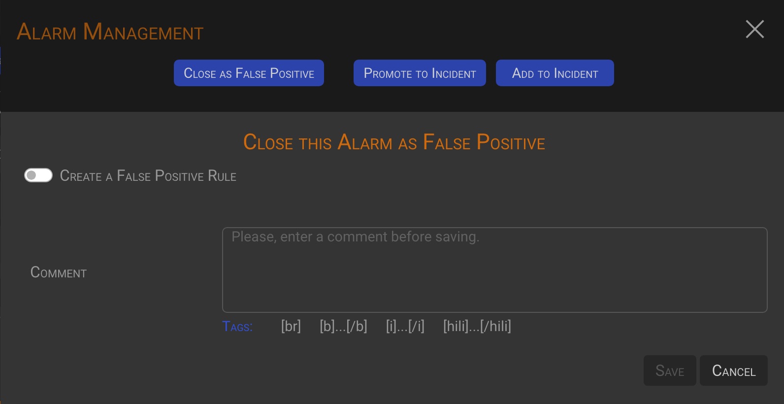 After entering a Comment, the Save button will be enabled, allowing you to close the alarm as a false positive.