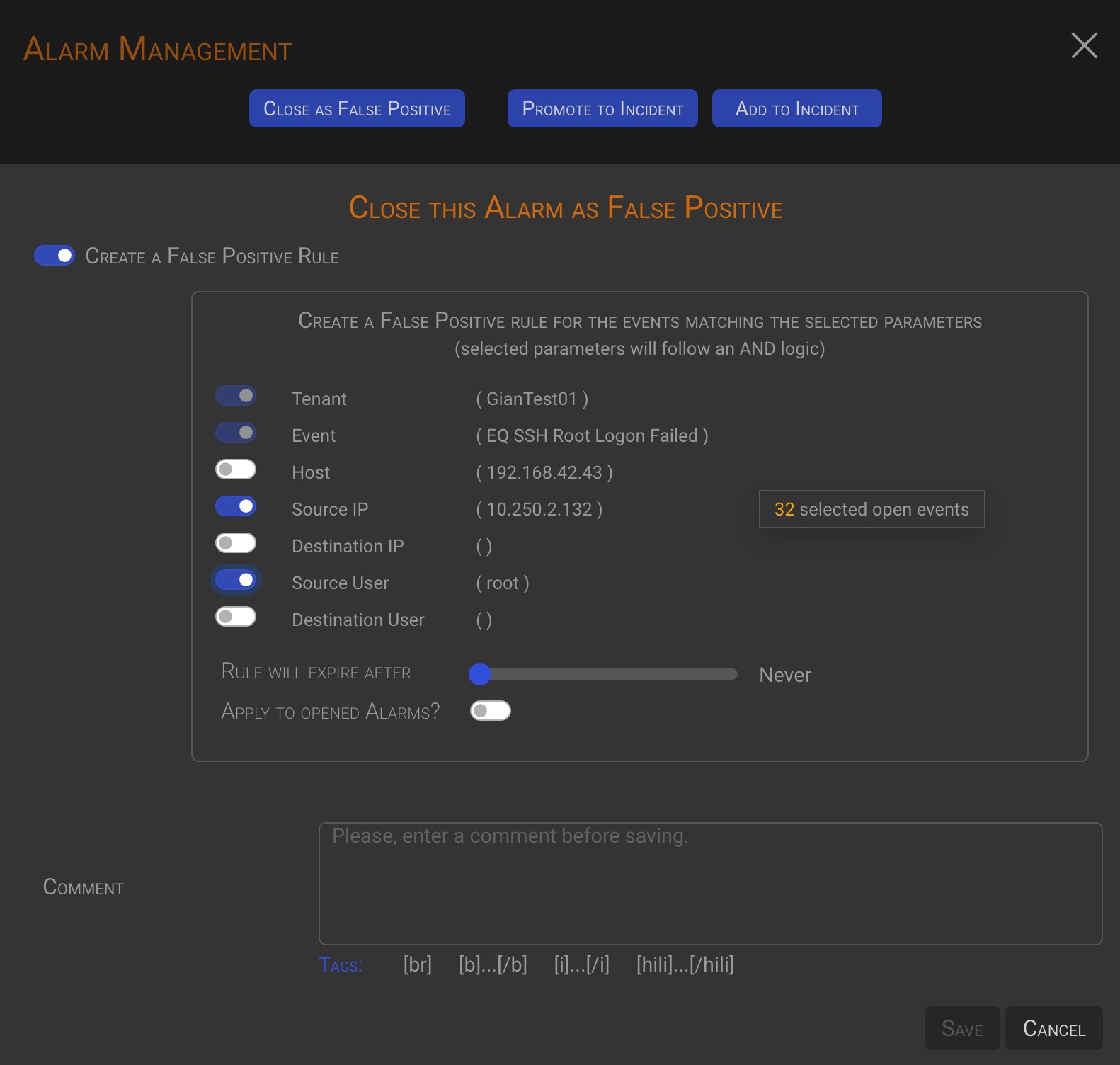 Enter a comment and click the Save button to save the rule and close the current alarm as a false positive