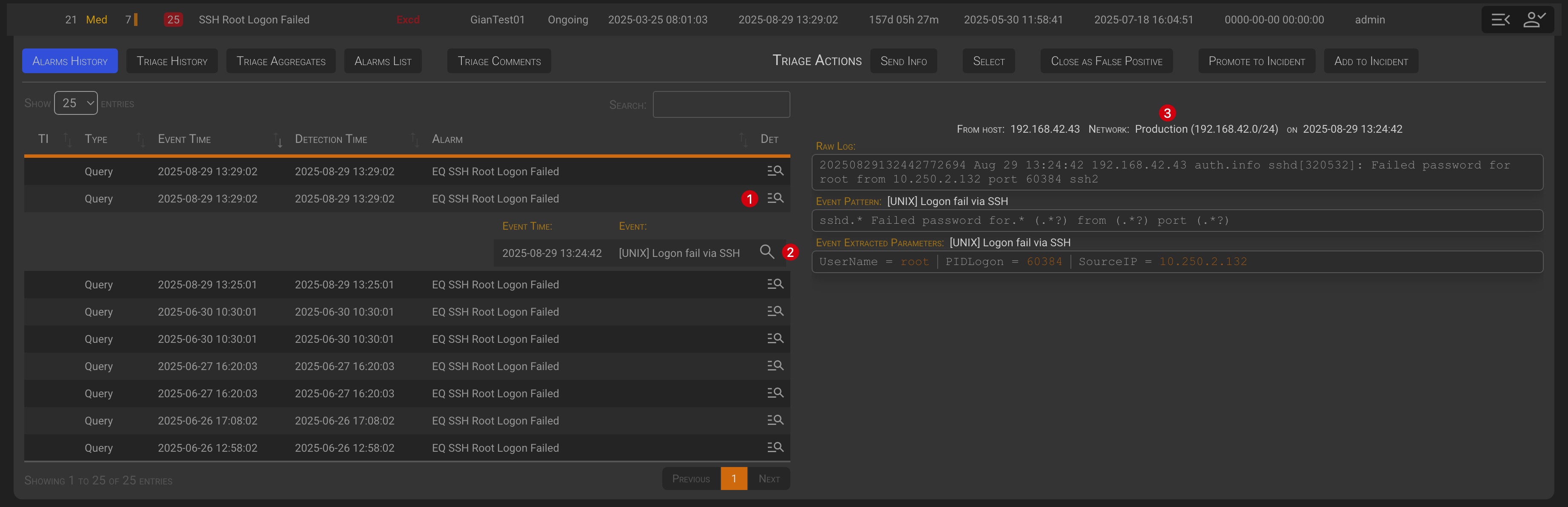 button (2) for each event to view its raw log, pattern, and extracted parameters (3), as well as its alarm details.