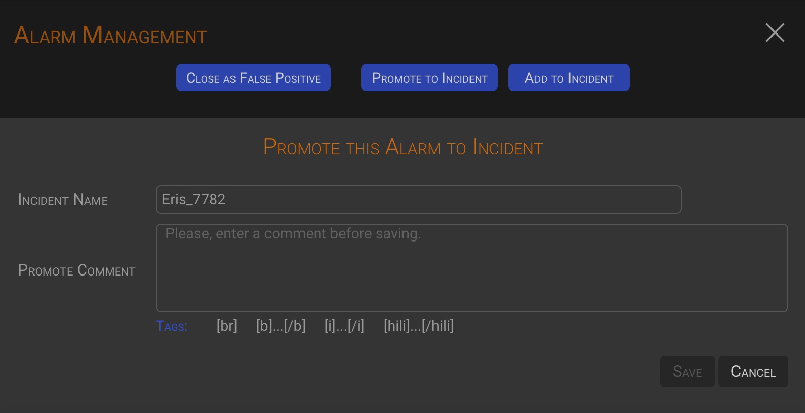 The system generates a unique Incident Name, but you can change it to your own text. After entering a Promote Comment, the Save button will be enabled, allowing you to create the new incident.