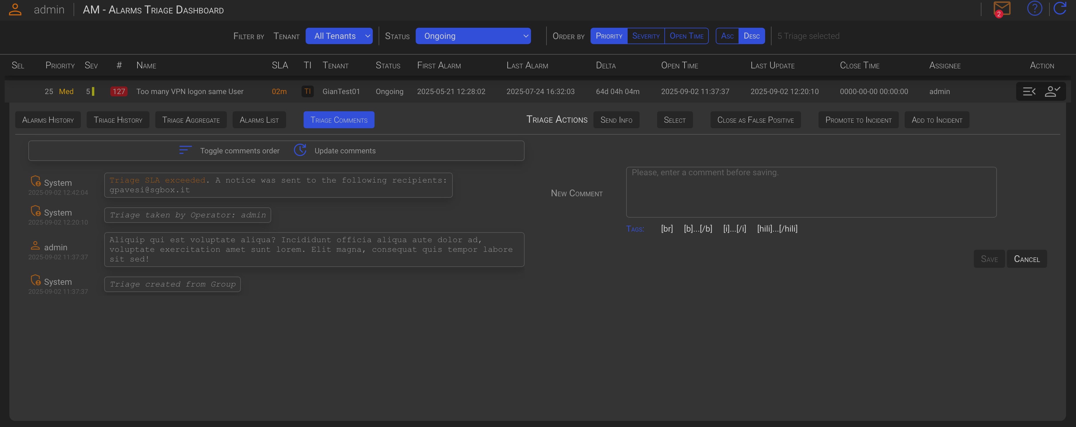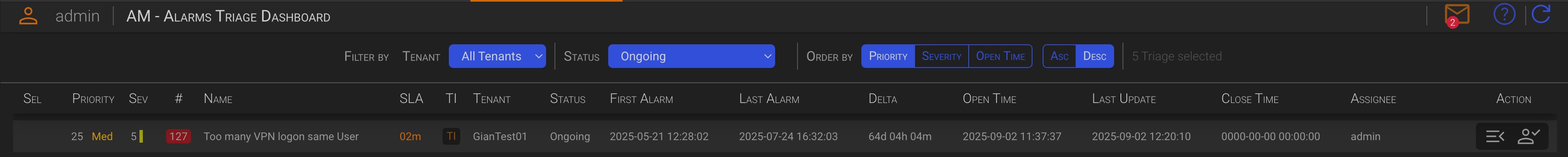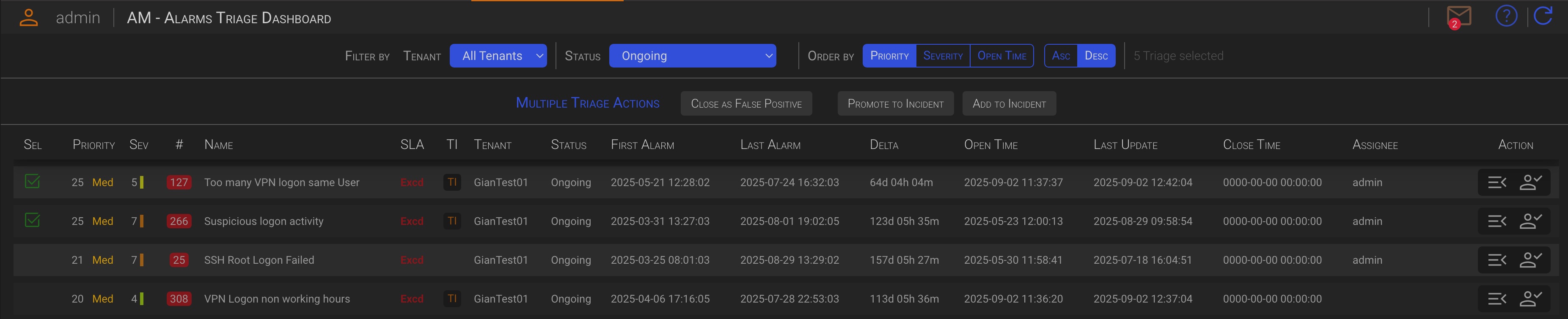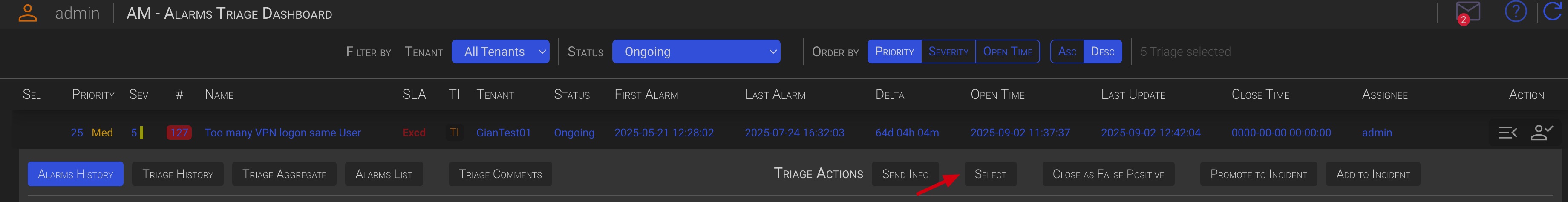 The Select function allows you to group two or more triages, coming from the same Tenant, and take one of the available actions against them.