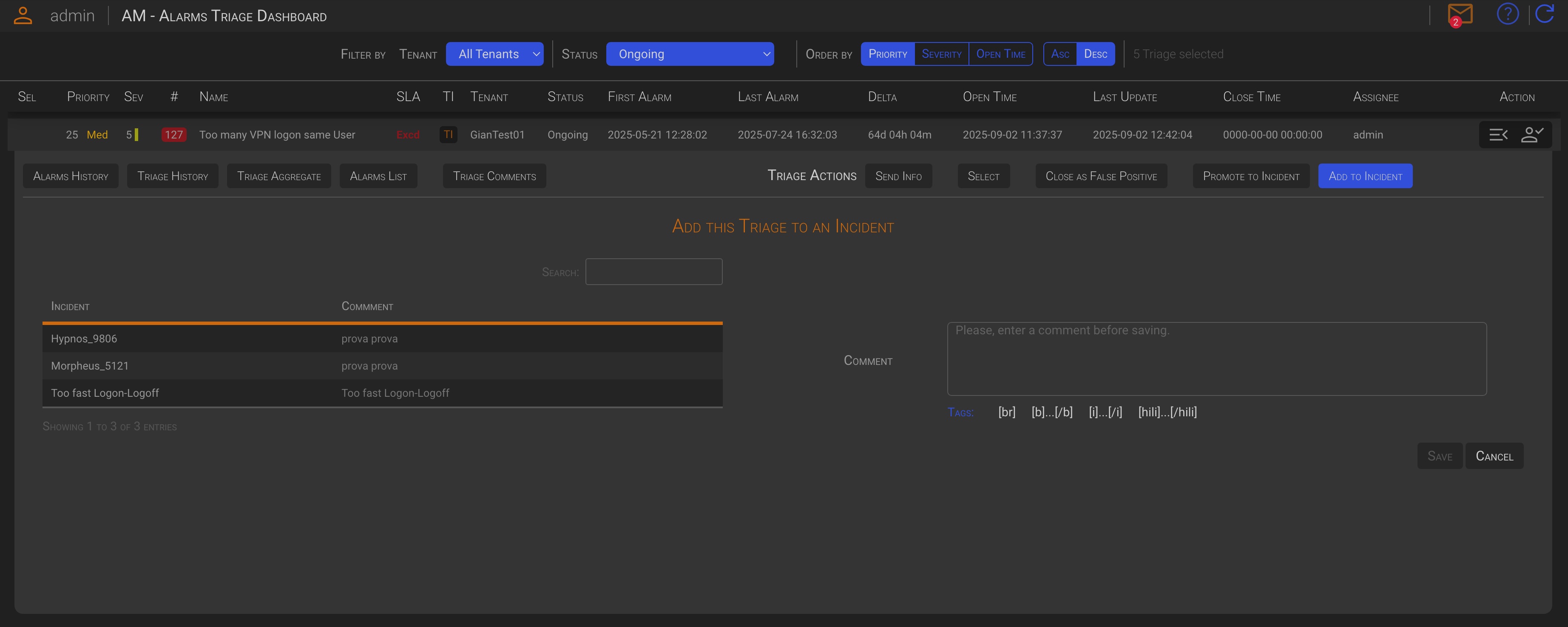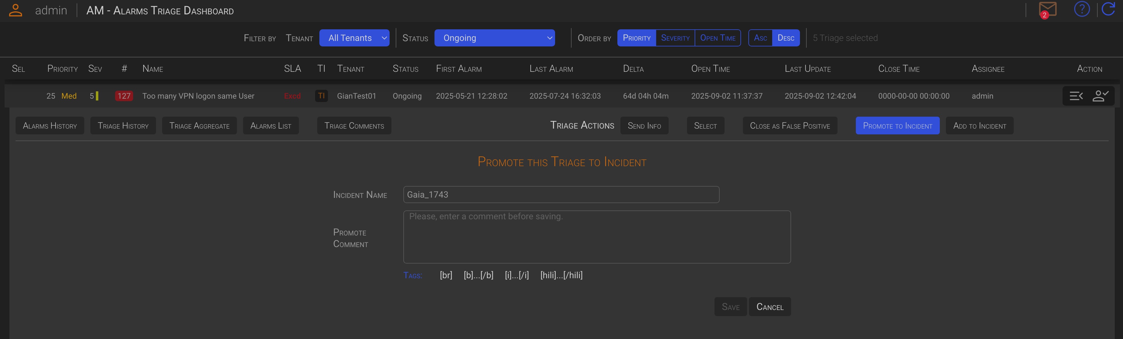 After entering a Comment, the Save button will be enabled, allowing you to promote the current triage, or the selected triages, to a new incident.
