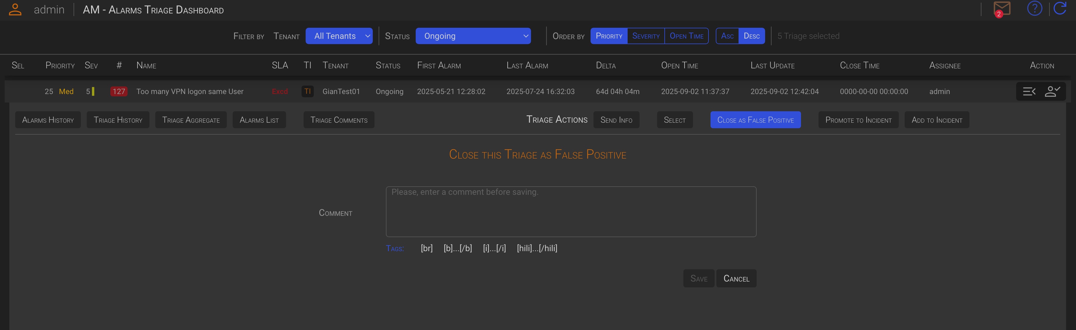After entering a Comment, the Save button will be enabled, allowing you to close the triage, or the selected triages, as a false positives.