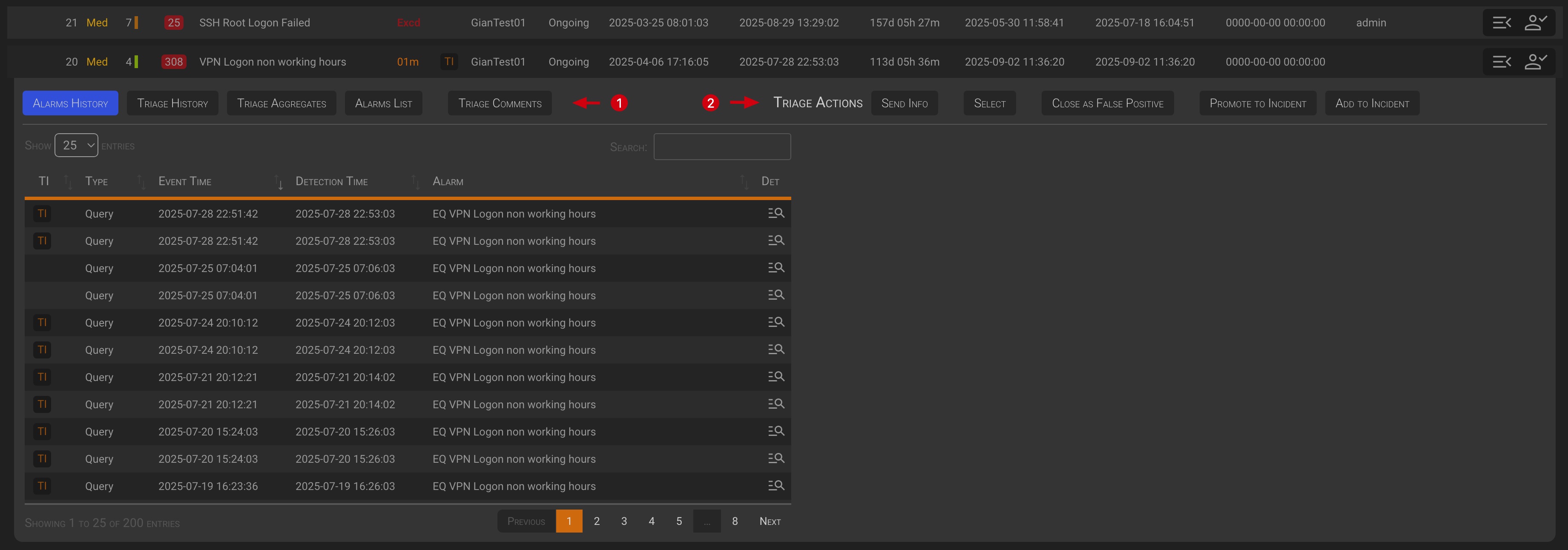 Triage management panel will open with the triage’s alarm history tab open by default.