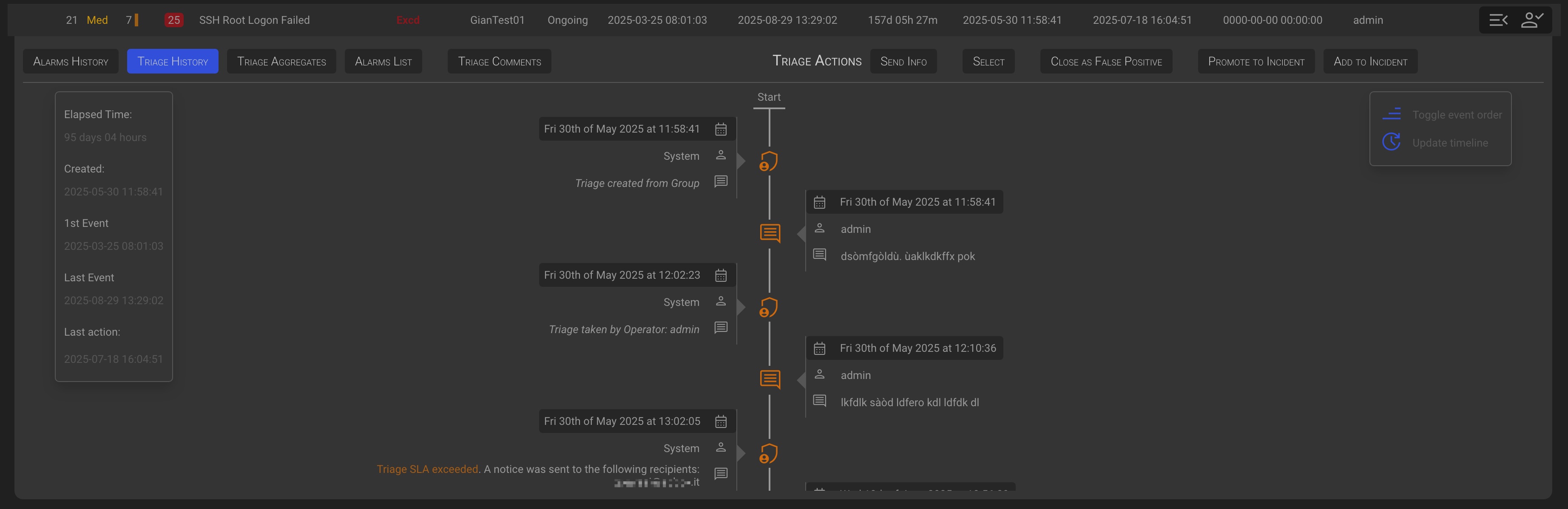 In the Triage History tab you will find the triage timeline. A chronological list of all management action taken against the triage by the users and the backend functions.