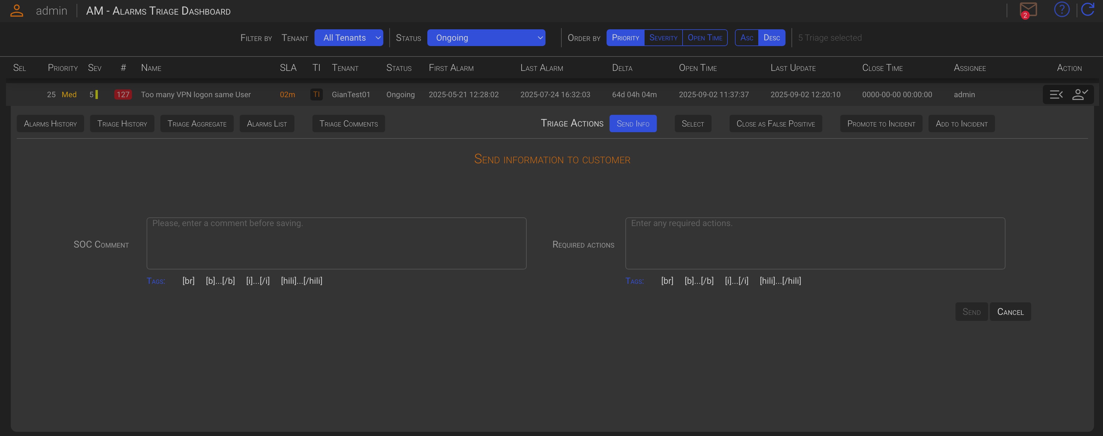 The Send Info tab allows you to send an information request on the current triage to the customer recipients defined for the current tenant in Tenant’s Criteria. The email will include triage details, alarm details, and raw logs.